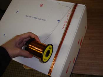 @ エナメル線を段ボール箱のふちに沿って30回巻く。