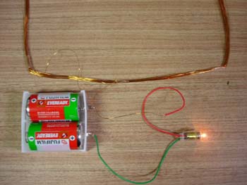 A コイルに電池と豆電球をつなげて直列回路を作る。